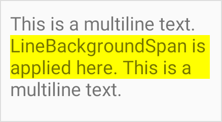 String text = "This is a multiline text. LineBackgroundSpan is applied here. This is a multiline text."; SpannableString string = new SpannableString(text); string.setSpan(new LineBackgroundSpan.Standard(Color.YELLOW), 26, 61, Spanned.SPAN_EXCLUSIVE_EXCLUSIVE);